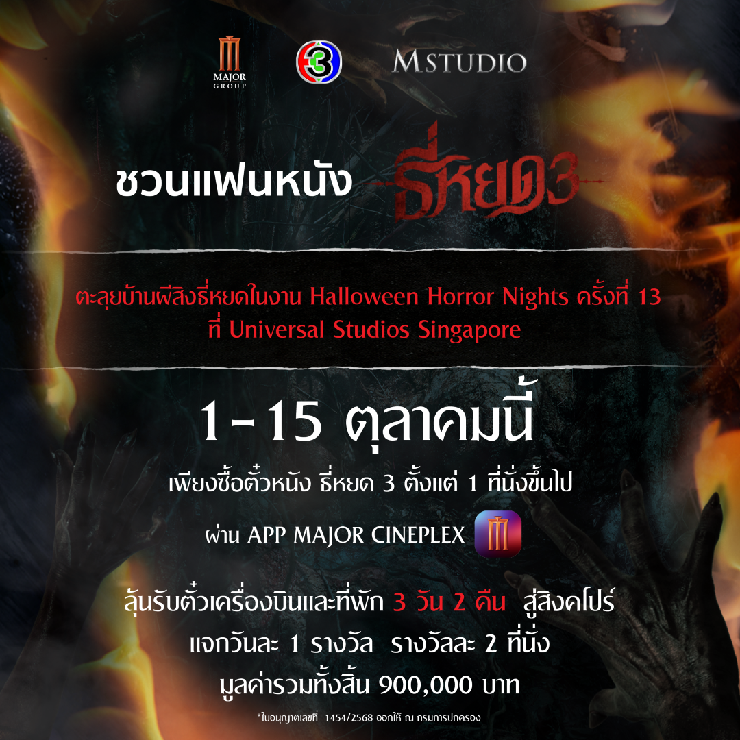 “M STUDIO” และ “ช่อง 3” ชวนแฟนหนังซื้อตั๋วชมภาพยนตร์ “ธี่หยด 3” ระหว่างวันที่ 1–15 ตุลาคมนี้ ลุ้นบินลัดฟ้าสู่สิงคโปร์! ตะลุยบ้านผีสิงธี่หยด ณ Universal Studios Singapore