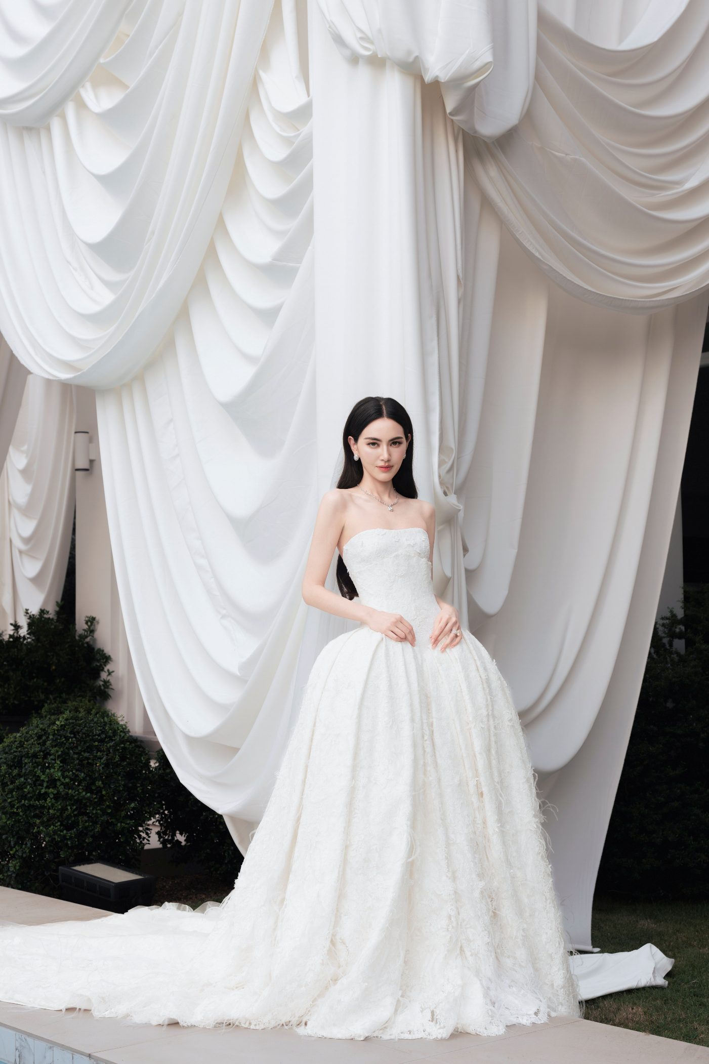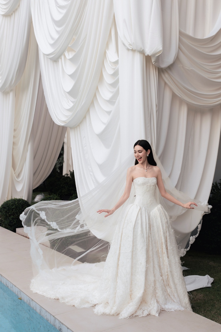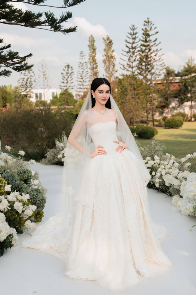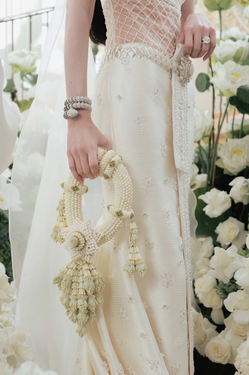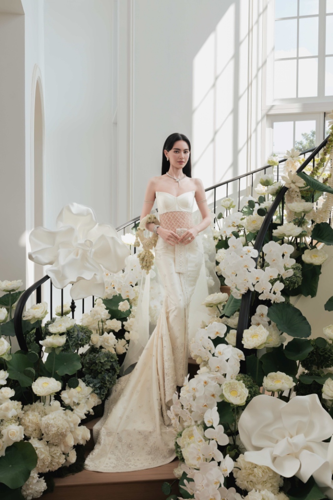 ชุดเจ้าสาวผ้าลูกไม้สีขาวไอวอรี่ทั้งตัว ได้รับการออกแบบตัดเย็บเป็นสองเลเยอร์ โดยในเลเยอร์แรกที่อยู่ด้านนอกสำหรับงานพิธีนั้นมาในแบบคอร์เซ็ตผ้าลูกไม้รัดใต้อกเน้นทรวดทรงอันโปร่งบางของเจ้าสาว ติดกับช่วงล่างซึ่งเป็นกระโปรงผ้าลูกไม้ ในแบบเดียวกันลวดลายดอกไม้นานาพันธุ์ อีกทั้งยังมีผีเสื้อตัวน้อยจากผ้าลูกไม้ Guipure (กีพัวร์) ที่เกาะโดดเด่นอยู่บนชุดในแบบสามมิติ กว่า 1,700 ตัว แต่งแต้มความงามตั้งแต่ช่วงเอวจรดชายกระโปรง ซึ่งช่างฝีมือใช้ทักษะขั้นสูงในการตัดเย็บทั้งหมดด้วยมือทีละตัว เพื่อให้เกิดความสมดุลที่กลมกลืน ผ่านงานปักอย่างประณีตกว่า 120 ชั่วโมง ใช้แผ่นลูกไม้ยาวรวม 18 เมตร และด้ายฝ้าย Mercerized และ Gassed 100% น้ำหนักรวม 4 กิโลกรัม พร้อมเสริมรายละเอียดของชุดให้คอมพลีทยิ่งขึ้นด้วยขนนกนุ่มละมุนสีไอวอรี่เป็นระยะที่ตัวกระโปรงชั้นนอก กว่า 6 เมตร