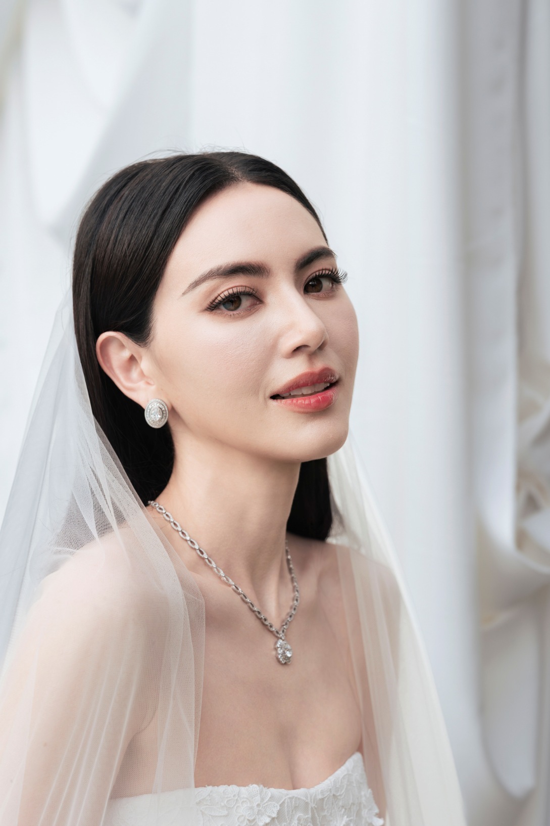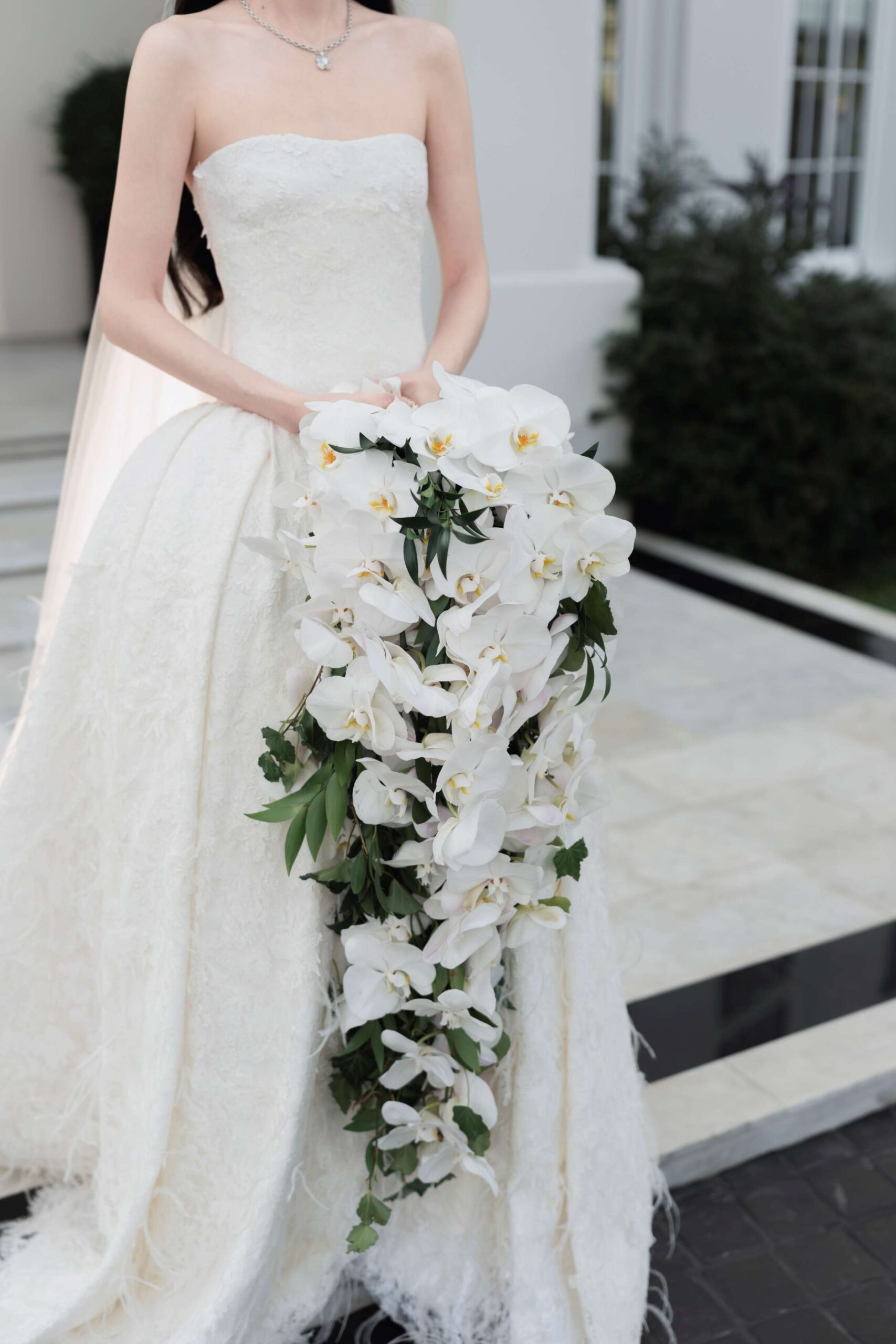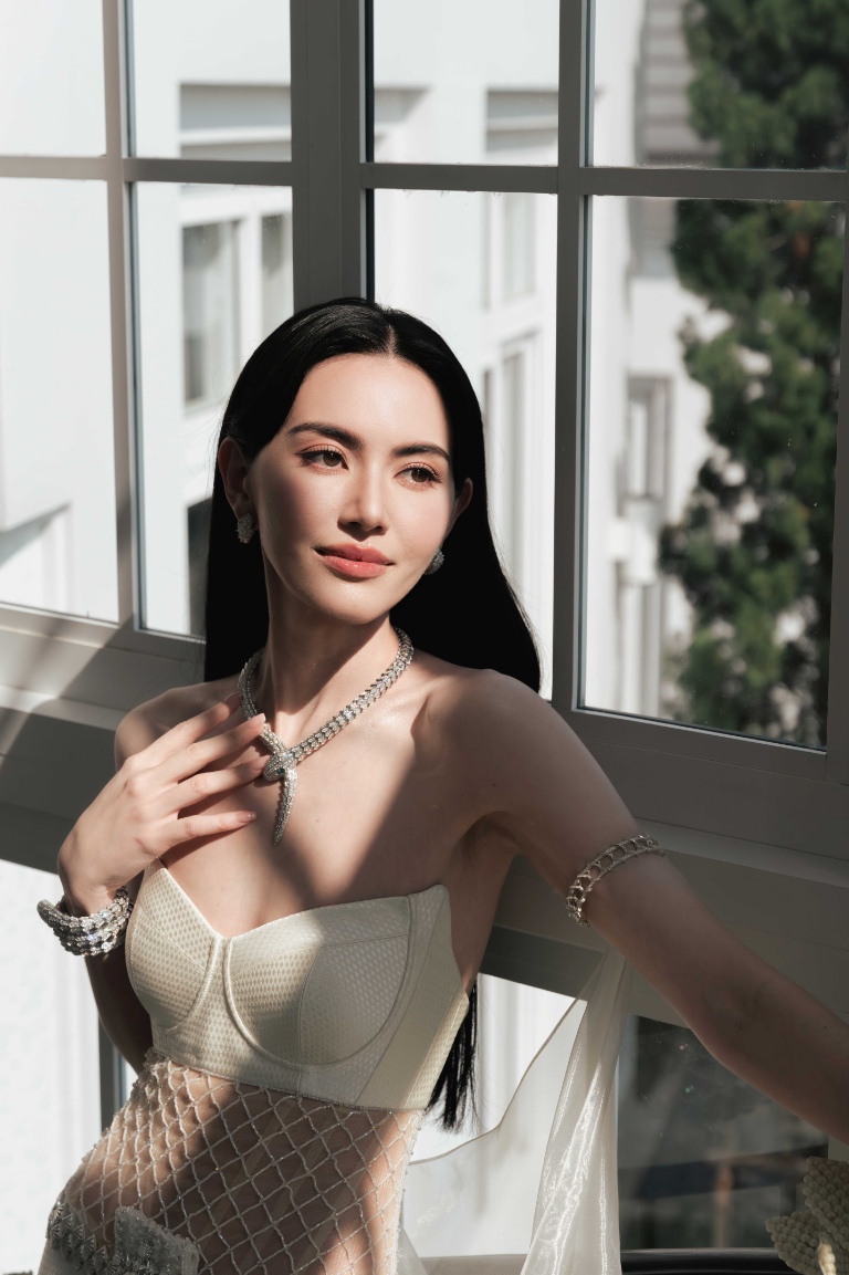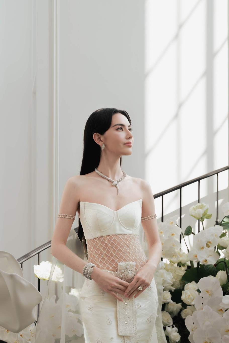 ชุดเจ้าสาวผ้าลูกไม้สีขาวไอวอรี่ทั้งตัว ได้รับการออกแบบตัดเย็บเป็นสองเลเยอร์ โดยในเลเยอร์แรกที่อยู่ด้านนอกสำหรับงานพิธีนั้นมาในแบบคอร์เซ็ตผ้าลูกไม้รัดใต้อกเน้นทรวดทรงอันโปร่งบางของเจ้าสาว ติดกับช่วงล่างซึ่งเป็นกระโปรงผ้าลูกไม้ ในแบบเดียวกันลวดลายดอกไม้นานาพันธุ์ อีกทั้งยังมีผีเสื้อตัวน้อยจากผ้าลูกไม้ Guipure (กีพัวร์) ที่เกาะโดดเด่นอยู่บนชุดในแบบสามมิติ กว่า 1,700 ตัว แต่งแต้มความงามตั้งแต่ช่วงเอวจรดชายกระโปรง ซึ่งช่างฝีมือใช้ทักษะขั้นสูงในการตัดเย็บทั้งหมดด้วยมือทีละตัว เพื่อให้เกิดความสมดุลที่กลมกลืน ผ่านงานปักอย่างประณีตกว่า 120 ชั่วโมง ใช้แผ่นลูกไม้ยาวรวม 18 เมตร และด้ายฝ้าย Mercerized และ Gassed 100% น้ำหนักรวม 4 กิโลกรัม พร้อมเสริมรายละเอียดของชุดให้คอมพลีทยิ่งขึ้นด้วยขนนกนุ่มละมุนสีไอวอรี่เป็นระยะที่ตัวกระโปรงชั้นนอก กว่า 6 เมตร