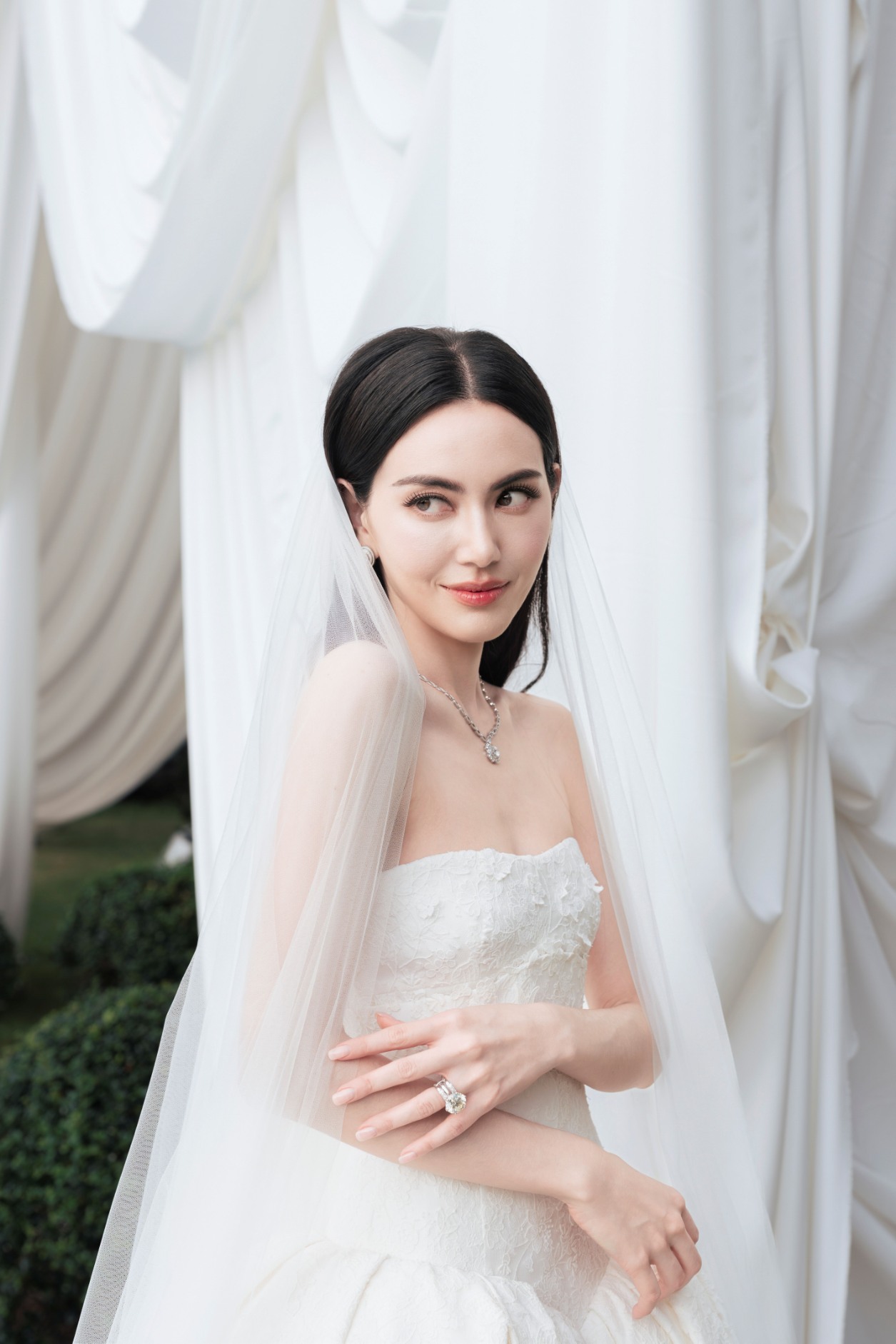 เวลผ้าทูลผืนยาวเนื้อบางเบาประดับด้วยลูกไม้ที่ชาย พร้อมรองเท้าตกแต่งด้วยผ้าลูกไม้ที่ได้รับการตัดเย็บด้วยผ้าเดียวกันกับตัวชุด ตกแต่งด้วยสัญลักษณ์ Bamboo ประดับคริสตัล อันเป็นหนึ่งในสัญลักษณ์สำคัญของ Gucci นอกจากนั้น ที่พื้นด้านในของรองเท้ายังมีชื่อของเจ้าสาวประทับอยู่ แสดงให้เห็นถึงรายละเอียดที่ได้รับการออกแบบมาเพื่อเจ้าสาว เพียงหนึ่งเดียวเท่านั้น
