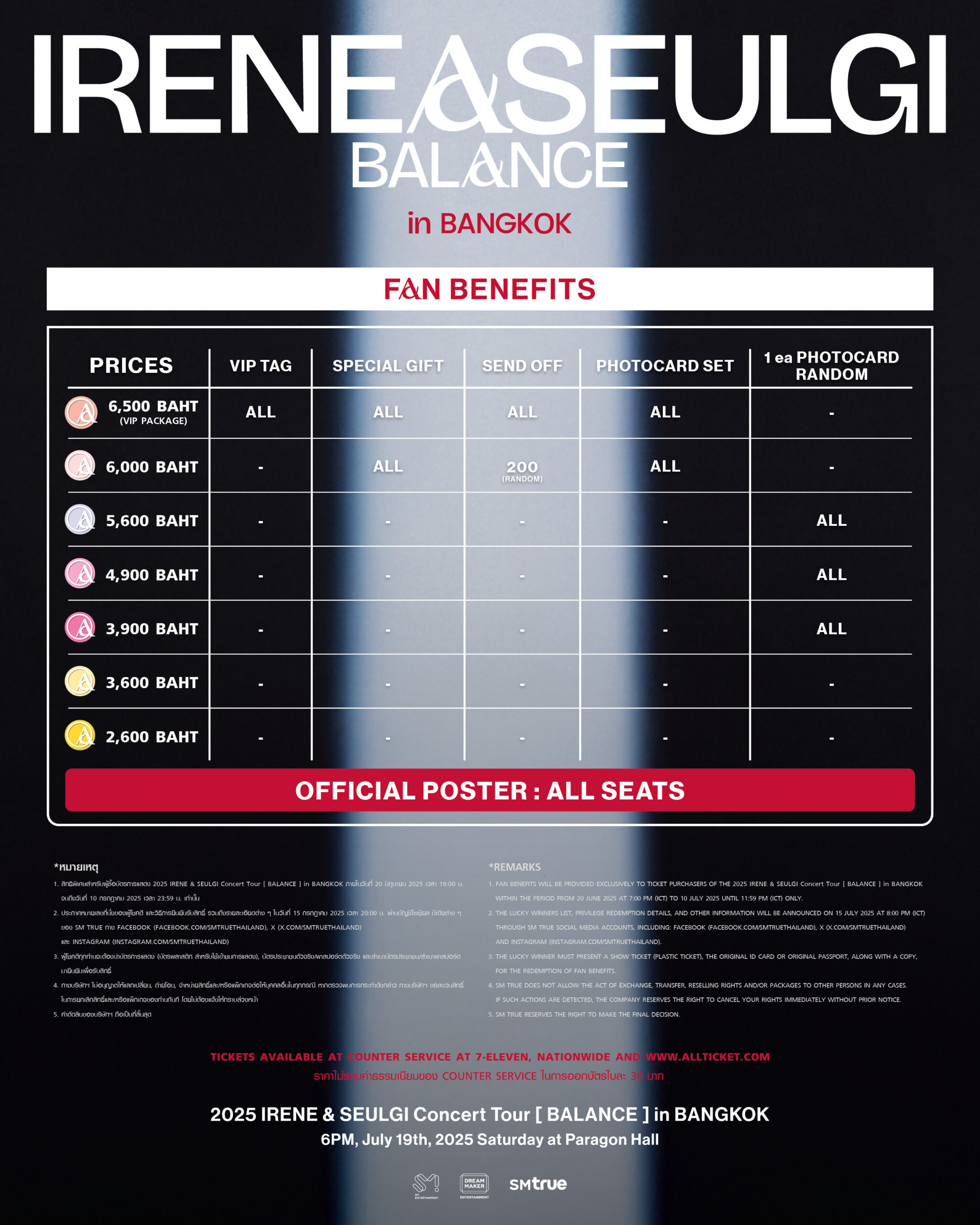 ร่วมพิสูจน์การรวมตัวอย่างไร้ที่ติ กับสุดยอดการแสดงบนเวที เสียงร้องที่ต่างมีเอกลักษณ์แต่ผสานเป็นหนึ่งเดียว และการจับคู่ภาพลักษณ์ที่แข็งแกร่งที่สุดในคอนเสิร์ต ‘2025 IRENE & SEULGI Concert Tour [ BALANCE ] in BANGKOK’ เปิดจำหน่ายบัตรรอบสมาชิก “ReVeluv” Membership (GL) Pre-Sale ในวันศุกร์ที่ 20 มิถุนายน 2025 เวลา 19:00 น. – 23:59 น. ทางเว็บไซต์เท่านั้น และรอบบุคคลทั่วไป ในวันเสาร์ที่ 21 มิถุนายน 2025 ตั้งแต่เวลา 11:00 น. เป็นต้นไป ทางเคาน์เตอร์เซอร์วิสในร้าน 7-Eleven ทุกสาขาทั่วประเทศ และทางเว็บไซต์ www.allticket.com/event/2025_IRENE&SEULGI_BALANCE_in_BKK บัตรนั่งราคา 6,500 (VIP PACKAGE) / 6,000 / 5,600 / 4,900 / 3,900 / 3,600 / 2,600 บาท พร้อมสิทธิพิเศษสำหรับผู้ซื้อบัตร ติดตามข่าวสารและรายละเอียดเพิ่มเติมได้ทางบัญชีโซเชียล มีเดียต่าง ๆ ของ SM True : เฟซบุ๊ก facebook.com/smtruethailand, อินสตาแกรม instagram.com/smtruethailand และเอ็กซ์ x.com/SMTrueThailand สอบถามข้อมูลเพิ่มเติมเกี่ยวกับการซื้อบัตรได้ทาง Counter Service : อีเมล support@allticket.com และไลน์ออฟฟิเชียล @counterservice