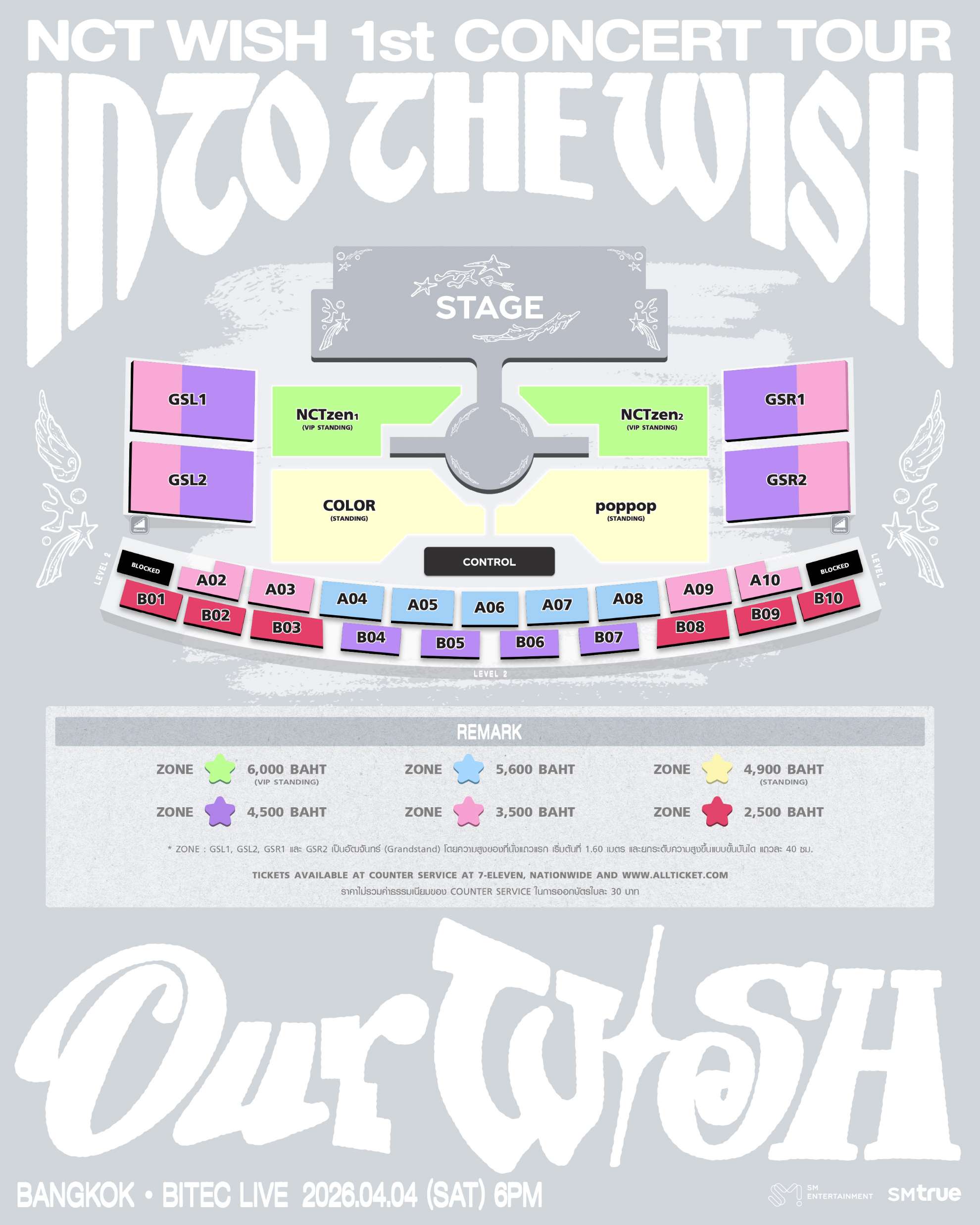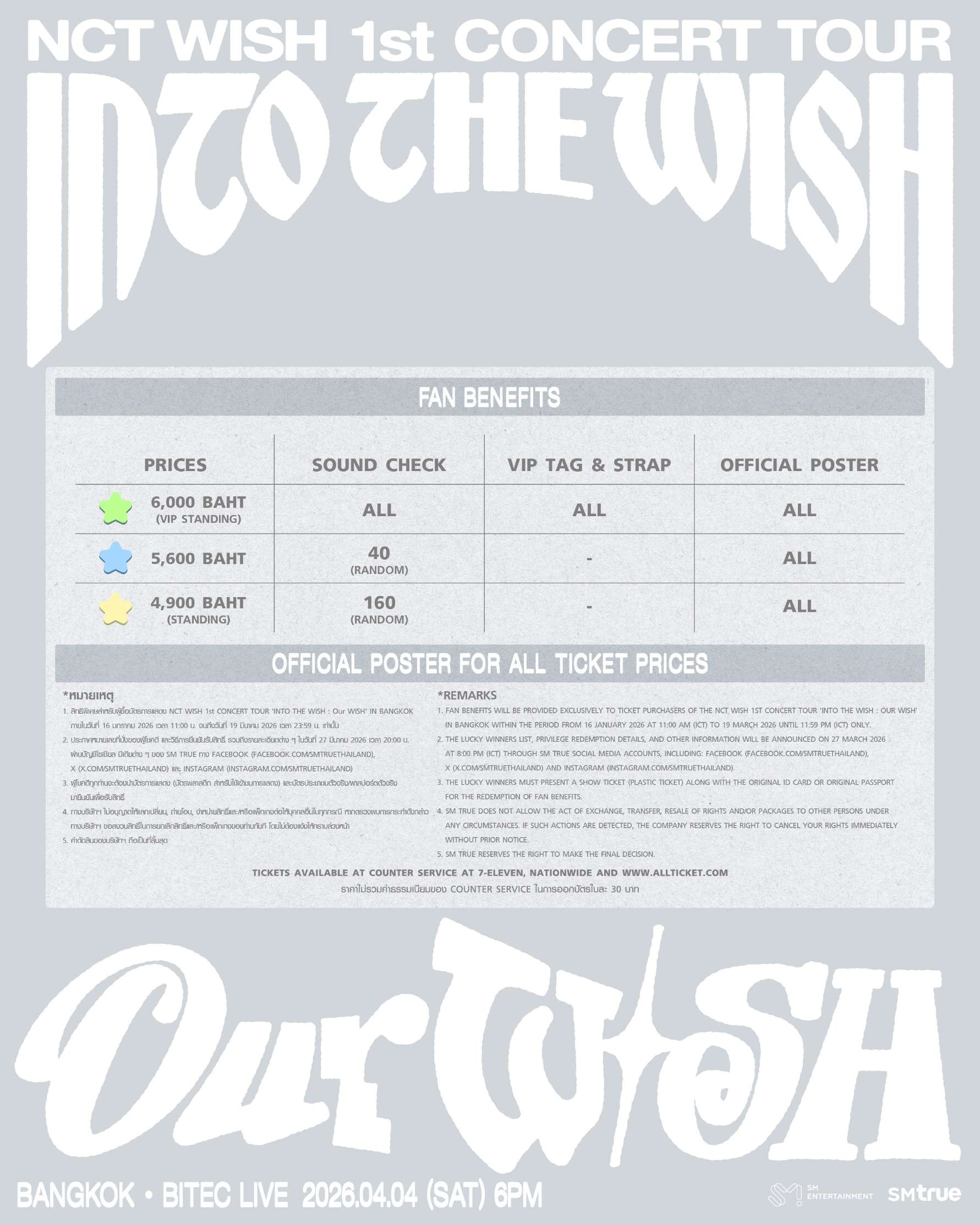 เมื่อ NCT WISH (เอ็นซีที วิช) และ NCTzen WISH (เอ็นซีทีเซ็น วิช) ถูกเชื่อมโยงไว้ด้วย “WISH เดียวกัน” ความปรารถนาที่จะได้อยู่ด้วยกันจะถูกเติมเต็มและกลายเป็นความจริงใน NCT WISH 1st CONCERT TOUR ‘INTO THE WISH : Our WISH’ IN BANGKOK (เอ็นซีที วิช เฟิสต์ คอนเสิร์ต ทัวร์ ‘อินทู เดอะ วิช : อาวเออร์ วิช’ อิน แบงค็อก) เปิดจำหน่ายบัตรรอบสมาชิก “NCTzen WISH” Membership (GL) Pre-Sale ในวันศุกร์ที่ 16 มกราคม 2026 เวลา 11:00 น. – 20:59 น. เท่านั้น และรอบบุคคลทั่วไป (General Sale) ในวันอาทิตย์ที่ 18 มกราคม 2026 ตั้งแต่เวลา 11:00 น. เป็นต้นไป ทางเคาน์เตอร์เซอร์วิสในร้าน 7-Eleven ทุกสาขาทั่วประเทศ และทางเว็บไซต์ www.allticket.com/event/NCTWISH_OurWISH_BANGKOK บัตรราคา 6,000 (VIP PACKAGE บัตรยืน) / 5,600 / 4,900 (บัตรยืน) / 4,500 / 3,500 / 2,500 บาท ติดตามข่าวสารและรายละเอียดเพิ่มเติมของคอนเสิร์ตได้ทางบัญชีโซเชียลมีเดียต่าง ๆ ของ SM True : เฟซบุ๊ก facebook.com/smtruethailand, อินสตาแกรม instagram.com/smtruethailand, เอ็กซ์ x.com/SMTrueThailand และ TikTok (ติ๊กต๊อก) tiktok.com/@smtruethailand สอบถามข้อมูลเพิ่มเติมเกี่ยวกับการซื้อบัตรได้ทาง Counter Service : อีเมล support@allticket.com และไลน์ออฟฟิเชียล @counterservice