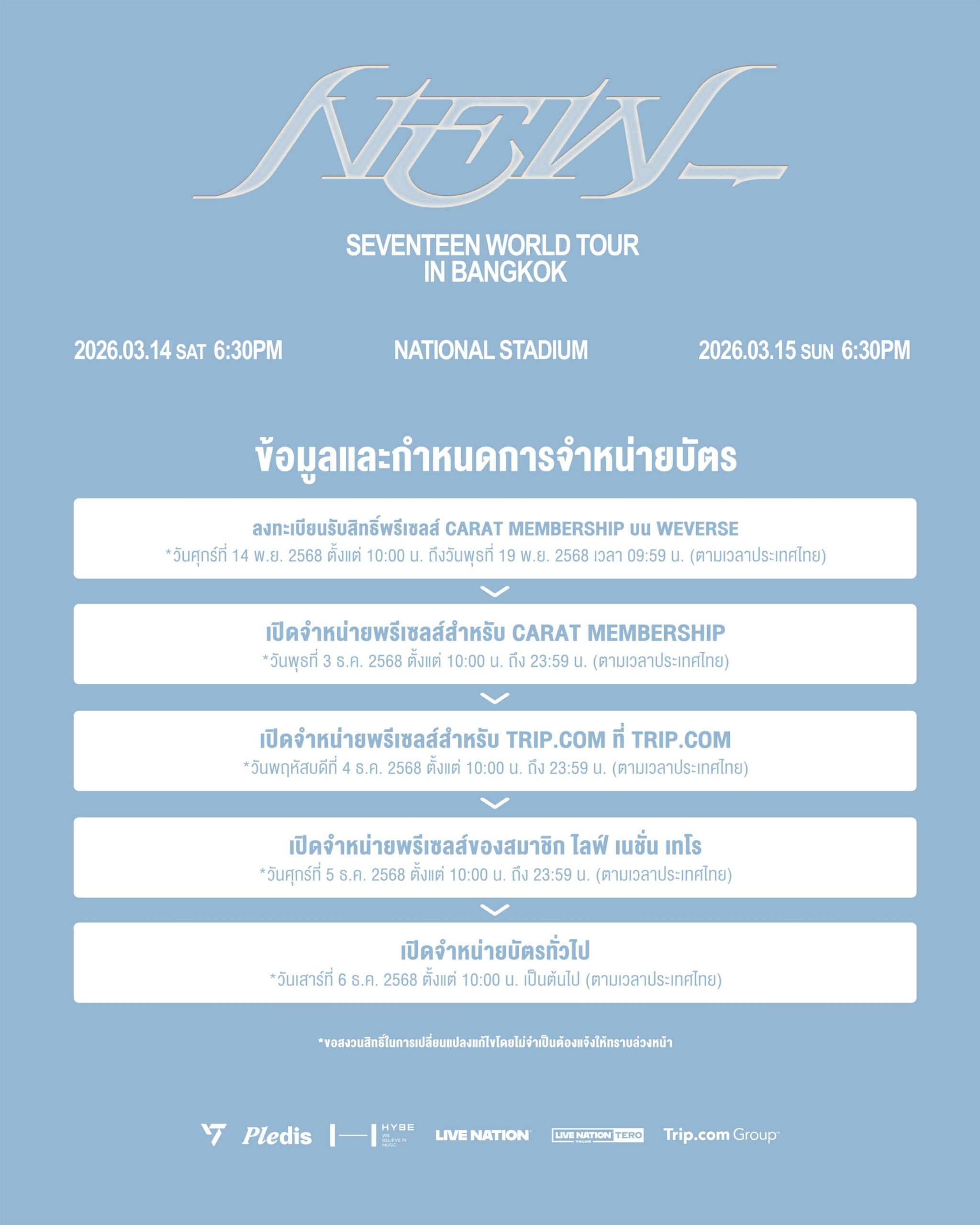 ศิลปินเคป๊อประดับโลก SEVENTEEN กลับมาอีกครั้งให้กะรัตไทยหายคิดถึงกลับเวิลด์ทัวร์สุดยิ่งใหญ่ จัดไปแบบใหม่ แบบศุภฯ ใน ‘SEVENTEEN WORLD TOUR [NEW_] IN BANGKOK’ เสาร์ที่ 14 และอาทิตย์ที่ 15 มีนาคม 2569 ที่สนามกีฬาแห่งชาติ (ศุภชลาศัย)