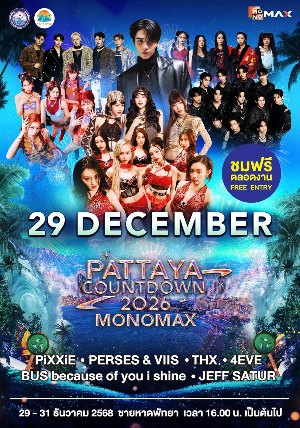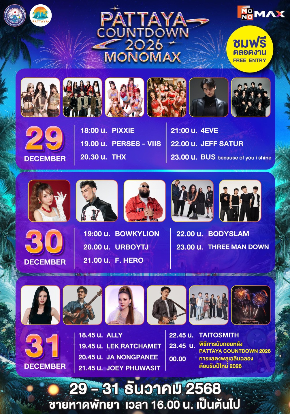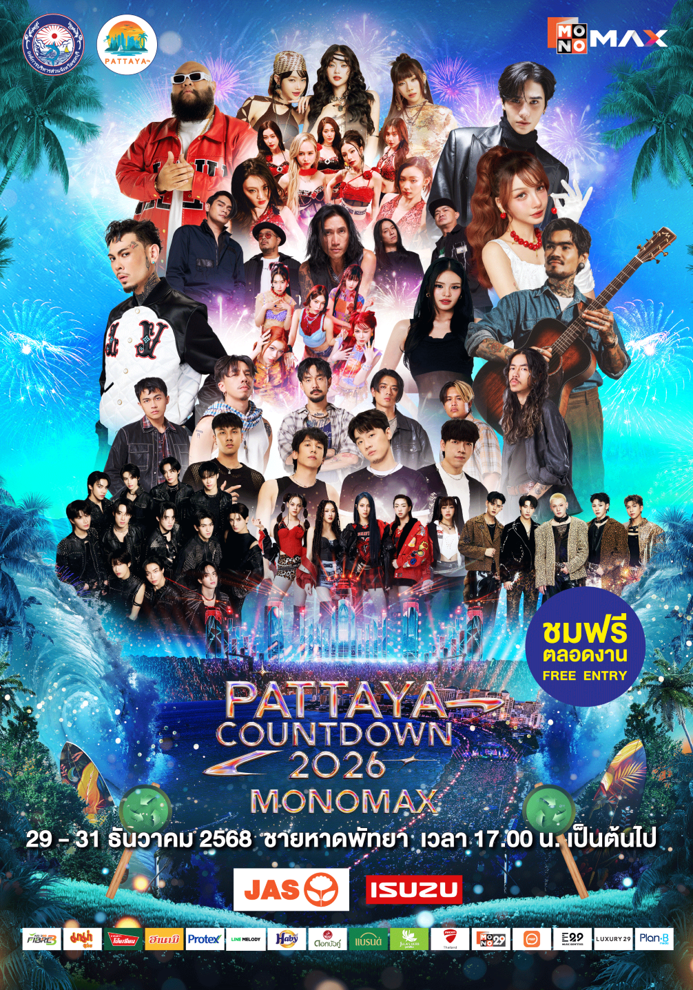 ทั้งนี้ งาน “PATTAYA COUNTDOWN 2026 MONOMAX” จัดเต็มความสนุกกับกิจกรรมหลากหลายตลอด 3 วัน 3 คืน ระหว่างวันที่ 29–31 ธันวาคม 2568 ตั้งแต่เวลา 16.00 น. เป็นต้นไป ณ บริเวณ ชายหาดพัทยา จังหวัดชลบุรี พร้อมการแสดง แสง สี เสียง สุดยิ่งใหญ่ ชมฟรีตลอดงาน วอร์มเสียง วอร์มร่างกายให้พร้อม แล้วมาเจอกันในช่วงเวลาแห่งความสุขส่งท้ายปีที่พัทยา