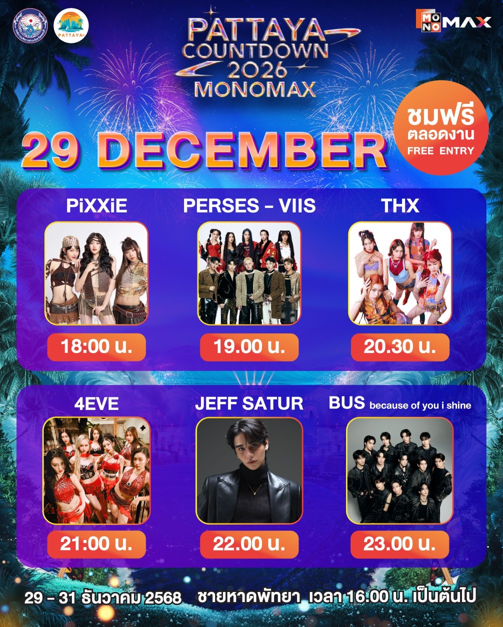 ทั้งนี้ งาน “PATTAYA COUNTDOWN 2026 MONOMAX” จัดเต็มความสนุกกับกิจกรรมหลากหลายตลอด 3 วัน 3 คืน ระหว่างวันที่ 29–31 ธันวาคม 2568 ตั้งแต่เวลา 16.00 น. เป็นต้นไป ณ บริเวณ ชายหาดพัทยา จังหวัดชลบุรี พร้อมการแสดง แสง สี เสียง สุดยิ่งใหญ่ ชมฟรีตลอดงาน วอร์มเสียง วอร์มร่างกายให้พร้อม แล้วมาเจอกันในช่วงเวลาแห่งความสุขส่งท้ายปีที่พัทยา